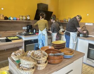 Les odeurs qui s’échappent de la cuisine ouverte sont un premier pas vers le bonheur. Ce jour-là il y a un velouté de pois cassés et carottes, des légumes à l’asiatique et un gâteau invisible aux pommes. Des bénévoles sont en train de dresser de longues tables pour le déjeuner. D’autres s’activent dans la cuisine avec Sandrine Libeaut qui coordonne les opérations.