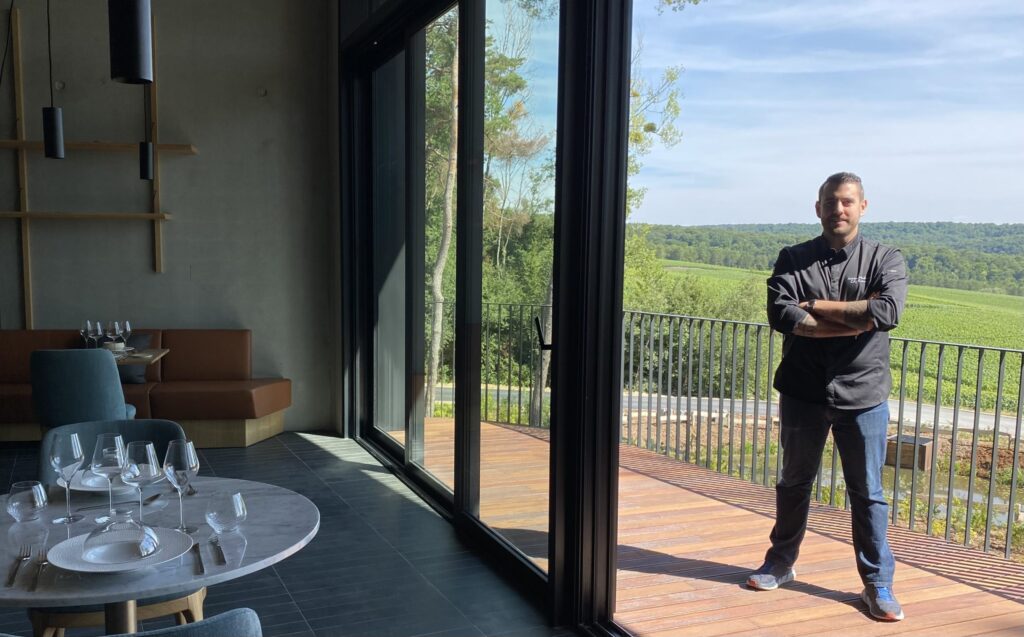La cuisine est ouverte sur les salles. 120 couverts pour la partie bistronomique, 40 pour le restaurant gastronomique. Les tables surplombent les vignes, comme le SPA et la piscine. Le chef s’appelle Antoine Madeleine. À 25 ans il est déja passé chez Georges Blanc, Anne Sophie Pic, au Martinez à Cannes, au Negresco, à Nice, au Four Seasons à Saint Jean Cap Ferrat, avant l’Australie, la Nouvelle Zélande et Bora Bora. Il salue la démarche écoresponsable de l’établissement qui sera aussi la sienne : producteurs locaux, carte végétarienne à 50%. Tous les champagnes servis à table seront disponibles à la vente. Il vise un BIB gourmand pour bientôt sur la brasserie. Le macaron Michelin viendra plus tard. “C’est un gros bébé, dit-il, mais ça va aller”.