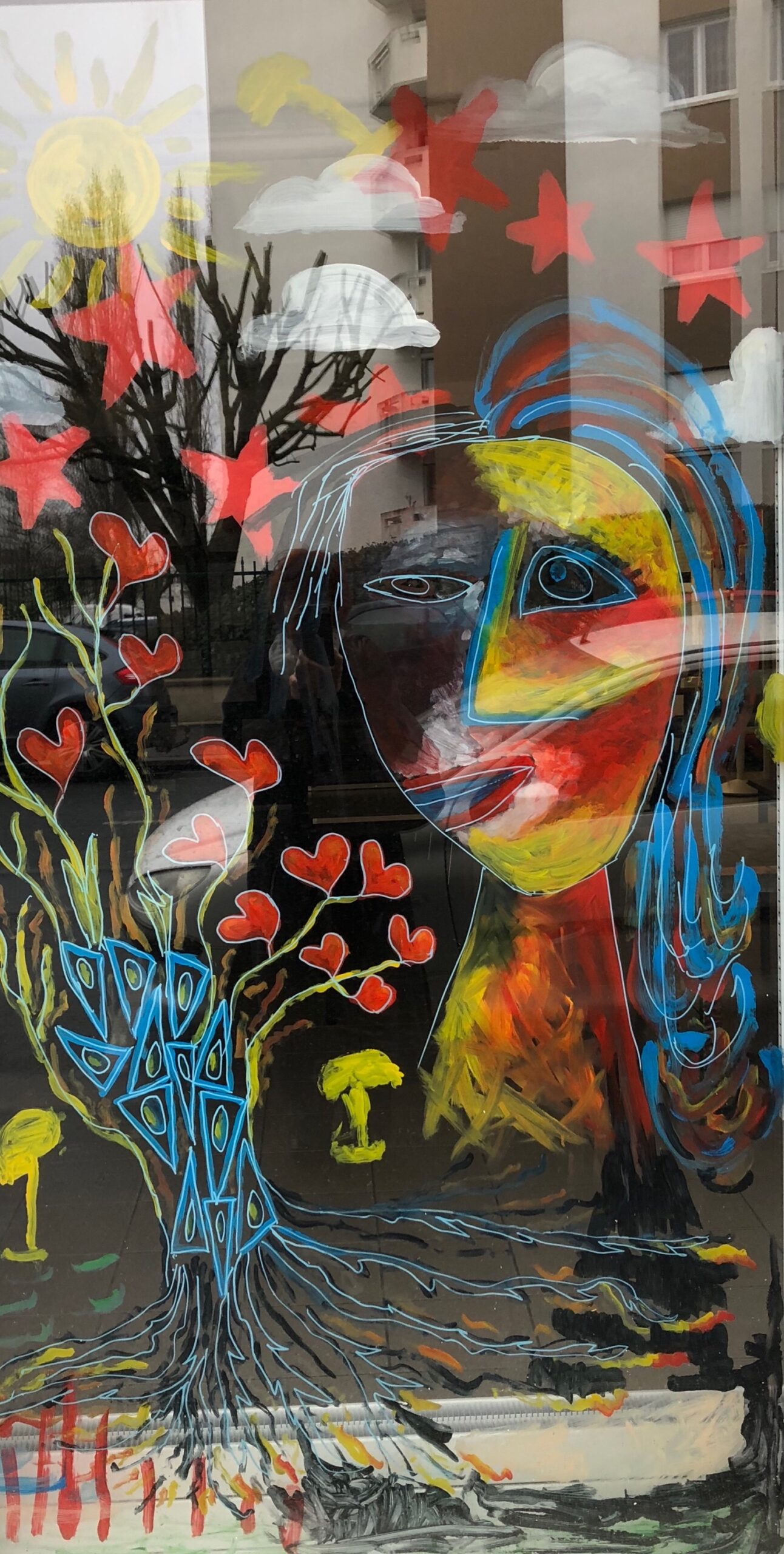 C’est une habitude au Cafégem de Reims : trois ou quatre fois par ans ce Groupe d’Entraide Mutuel ( loi 2005) organise des rencontres artistiques pour ses adhérents, une quinzaine de personnes en souffrance psychique, mais suffisamment autonomes pour participer aux activités qui leurs sont régulièrement offertes dans ce café associatif sans alcool : lecture, écriture, théâtre…Souvent isolés, ils sont aussi invités à s’exprimer sur quelques jours avec des artistes invités. Cette fois dans la grande salle de la Rue Passe-Demoiselles, l’atelier était centré sur le portrait, ou l’autoportrait. Et ils ont tout donné. La fresque qui est apparue sur la baie vitrée du Cafégem est éloquente. « Elle raconte mille et une vies » dit Nadine qui émerge tout juste de cette expérience ébouriffante. « On a vécu de grandes émotions tout le temps, on avait le droit d’avoir sa notion du beau pendant quatre jours de suite, on a pu sortir ce qu’on avait à sortir, tout le monde a pu accoucher de quelque chose de neuf qu’on avait au fond de nous même. » Sur le fauteuil d’à côté Anne Marie se remet doucement de ses émotions. « Jérémy a commencé à dessiner sur la vitre dans un style abordable pour tous, et ça m’a libérée, c’est parti, ça s’est enchaîné . On était dans une énorme concentration, attentif au travail de l’autre, il nous a solidarisés, on a tous exprimé ce qu’on ressent à partir du geste, c’était remarquable. »